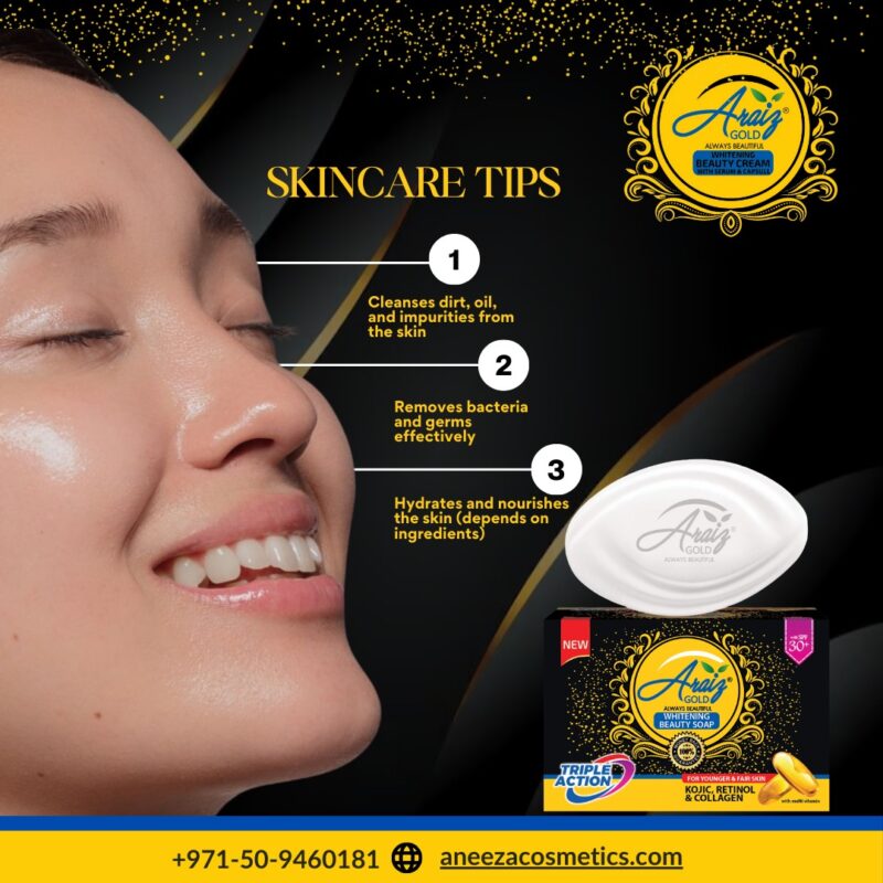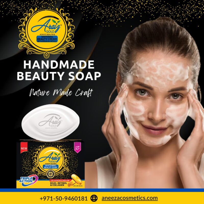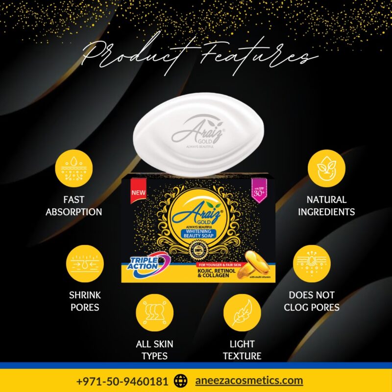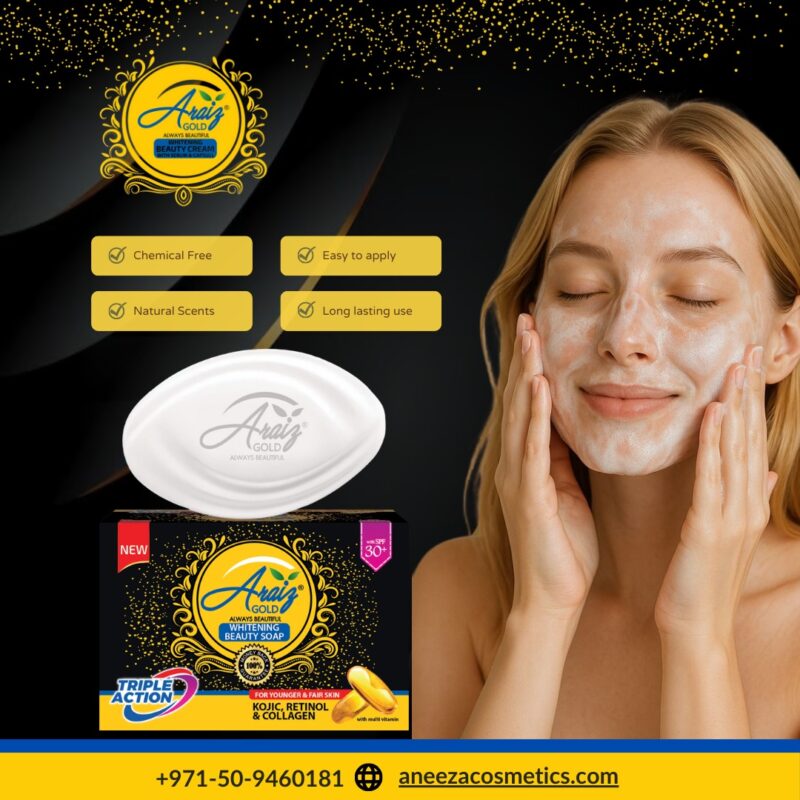 Araiz Gold Whitening Beauty Soap is a premium skincare soap enriched with Kojic, Retinol, and Collagen to give your skin a radiant glow. Its triple action formula helps in skin whitening, anti-aging, and nourishment, making your skin look younger, fairer, and smoother. Infused with multi-vitamins and SPF 30+, it protects your skin from harmful UV rays while reducing dark spots, fine lines, and uneven tone. Perfect for everyday use to achieve healthy, glowing, and beautiful skin.